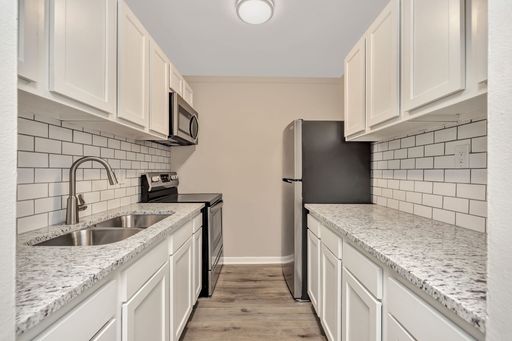 The apartment includes a bright and open living area with renovated finishes and a full kitchen equipped with a refrigerator, stove, range, dishwasher, and microwave. Residents enjoy features such as walk-in closets, patios or balconies, controlled building access, and off-street parking. Stainless steel appliances and modern updates enhance both style and convenience. Common area laundry is available on-site.